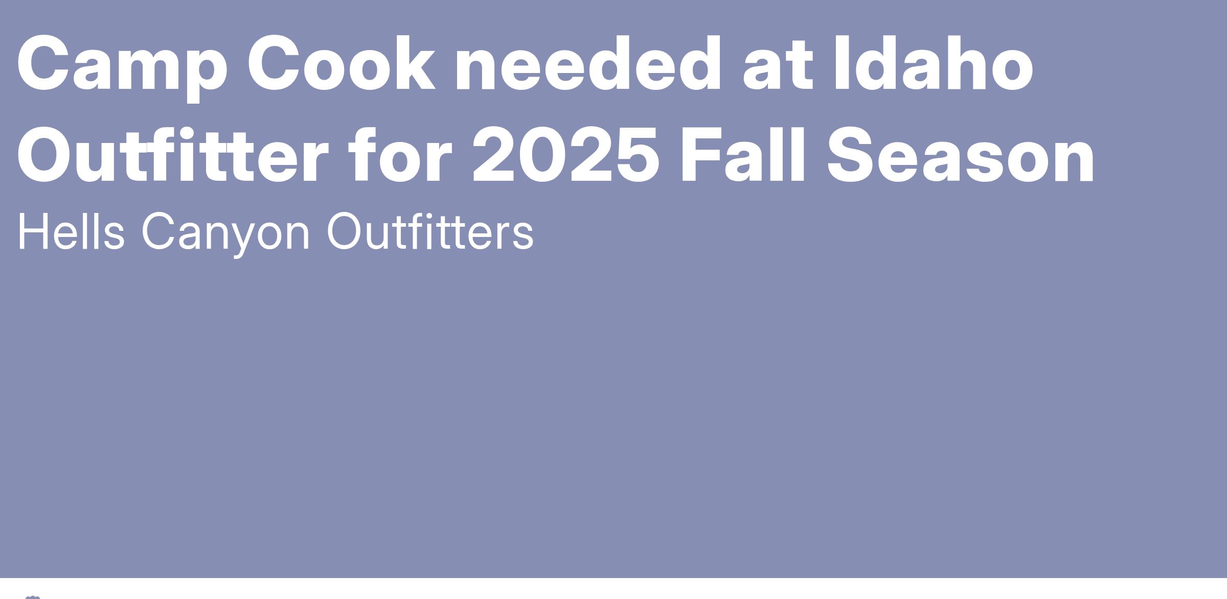 Hells Canyon Outfitters is looking for a backcountry cook for this fall. This job entails going into the wilderness on horseback and cooking out of a backcountry wall tent camp. Most of the time you will be cooking 3 meals/day for groups of 4-8 people. This is a fun and rewarding work environment.